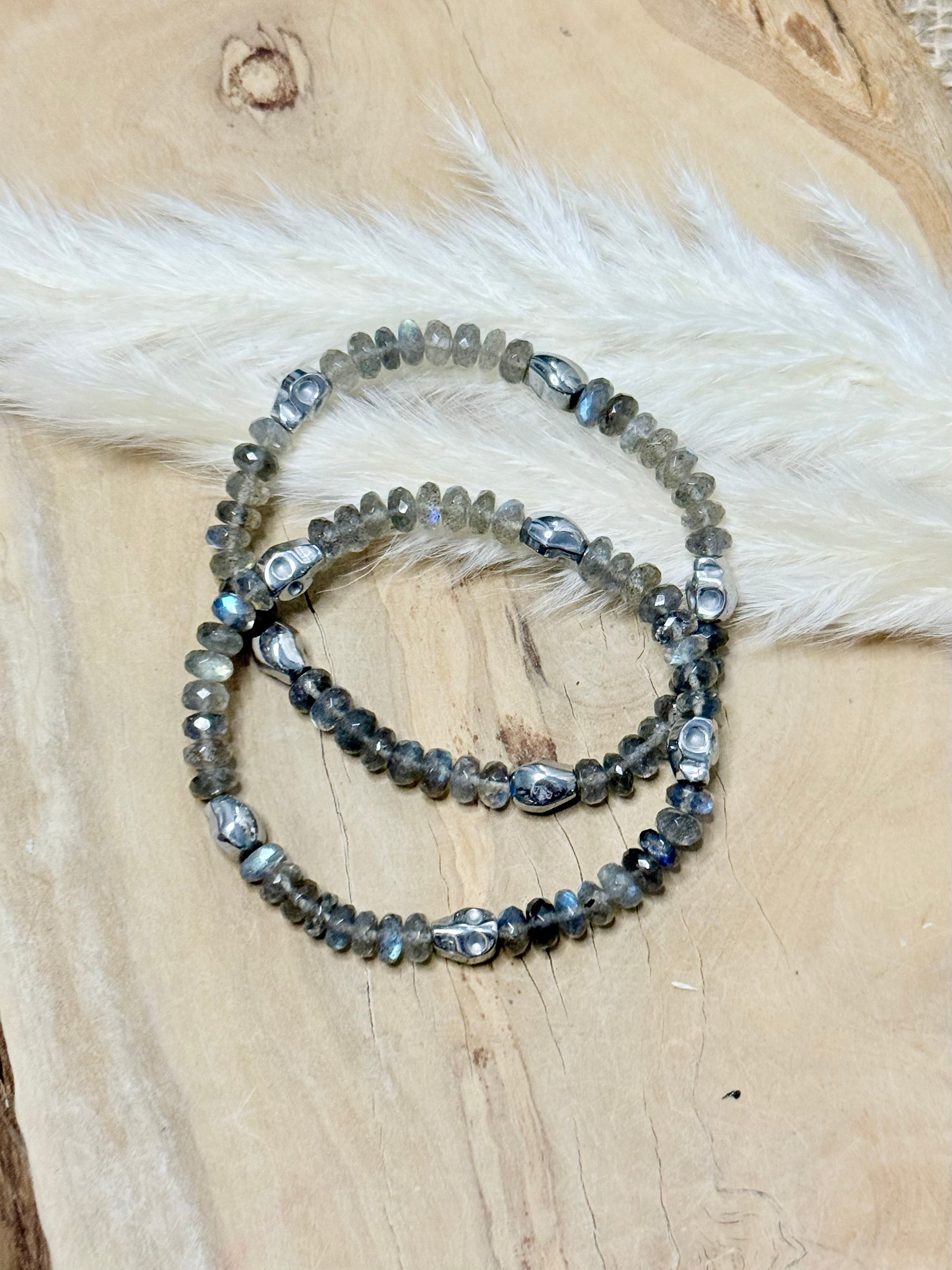 - Includes high-grade, blue flash labradorite rondelle gemstones with gold or silver hematite skull gemstones