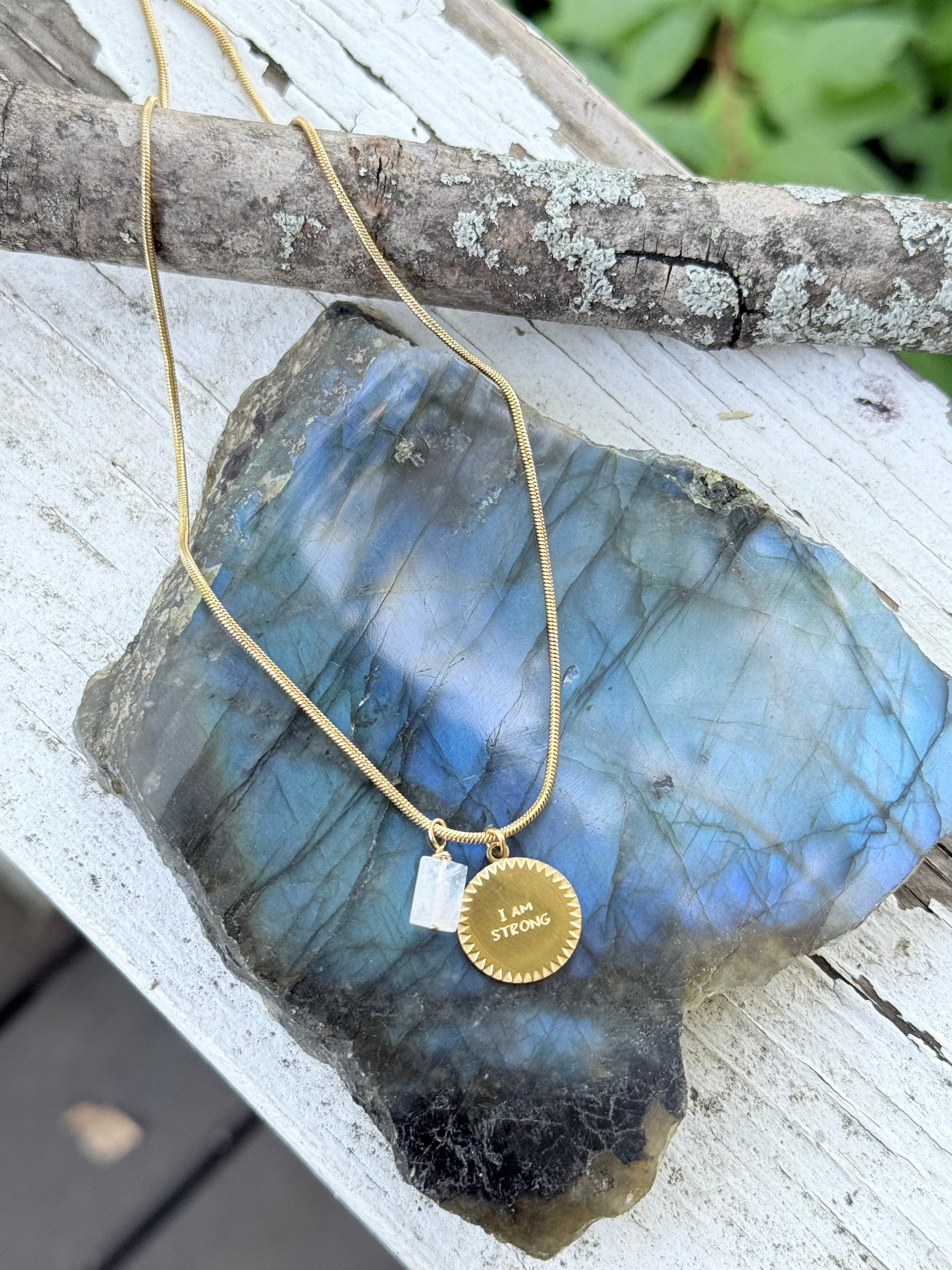 - Includes a gold stainless steel pendant with the wording "I AM STRONG" and a moonstone pendant for strength
