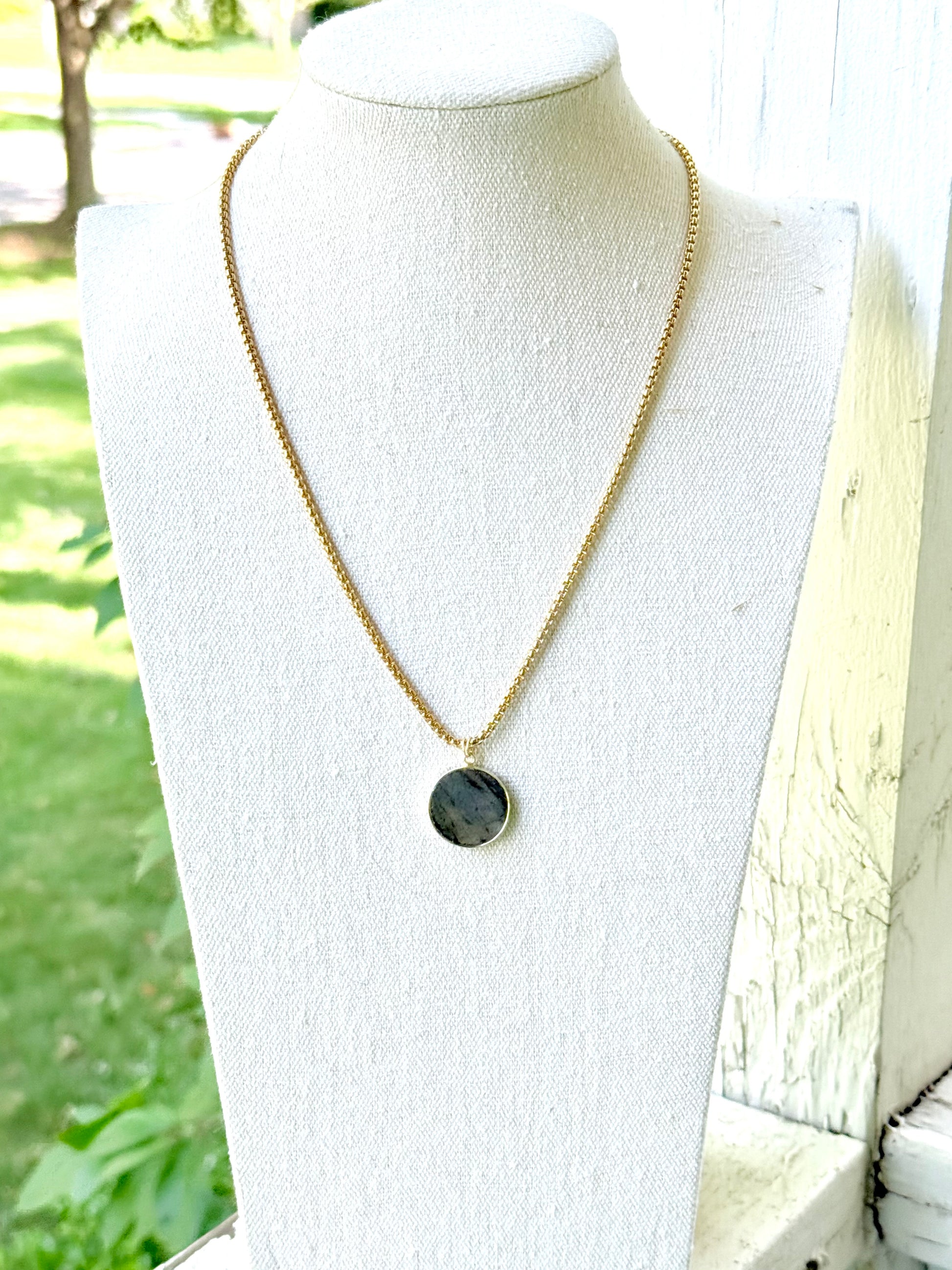 - Includes an flashy, blue, labradorite pendant in the shape of a circle