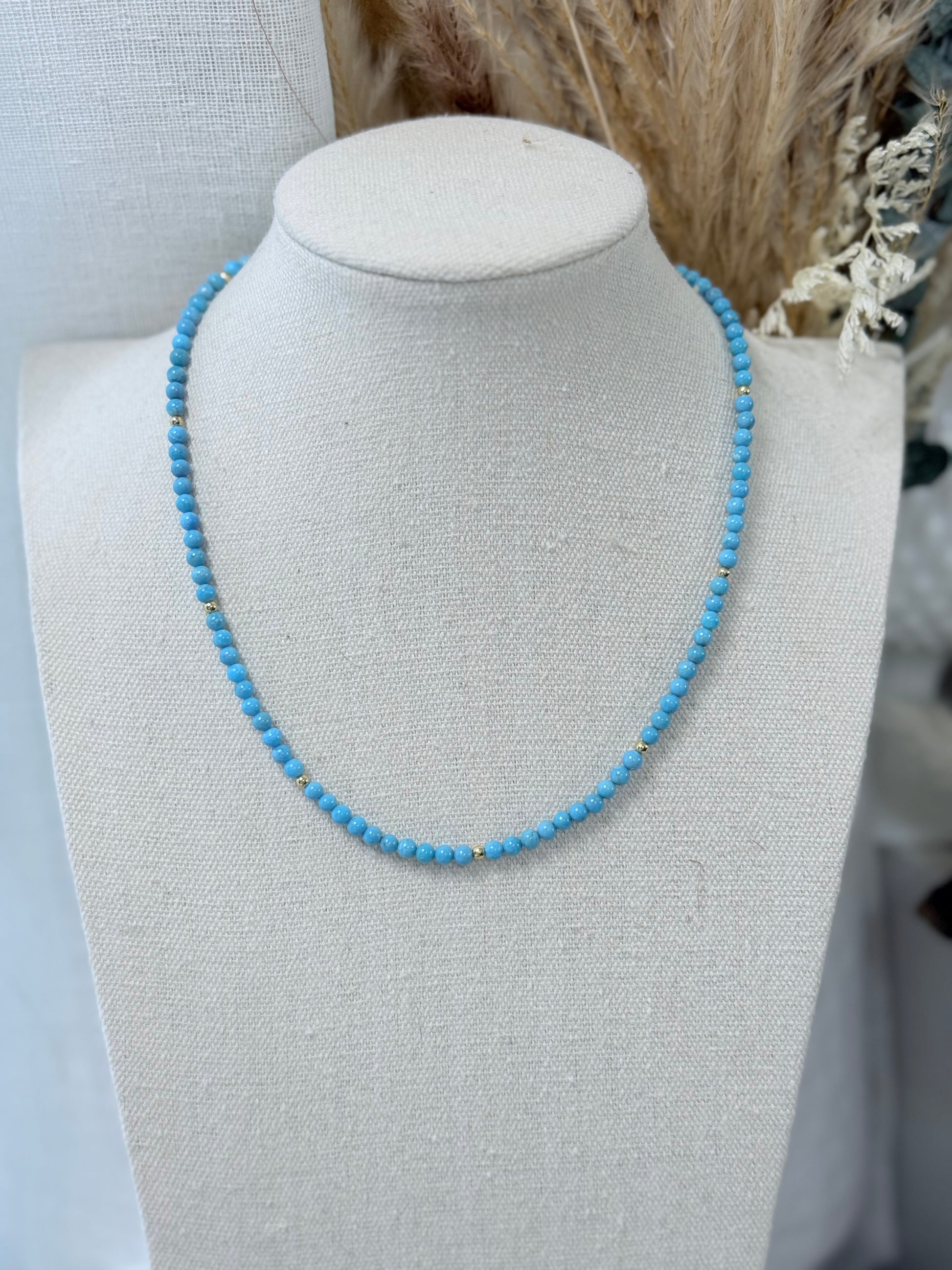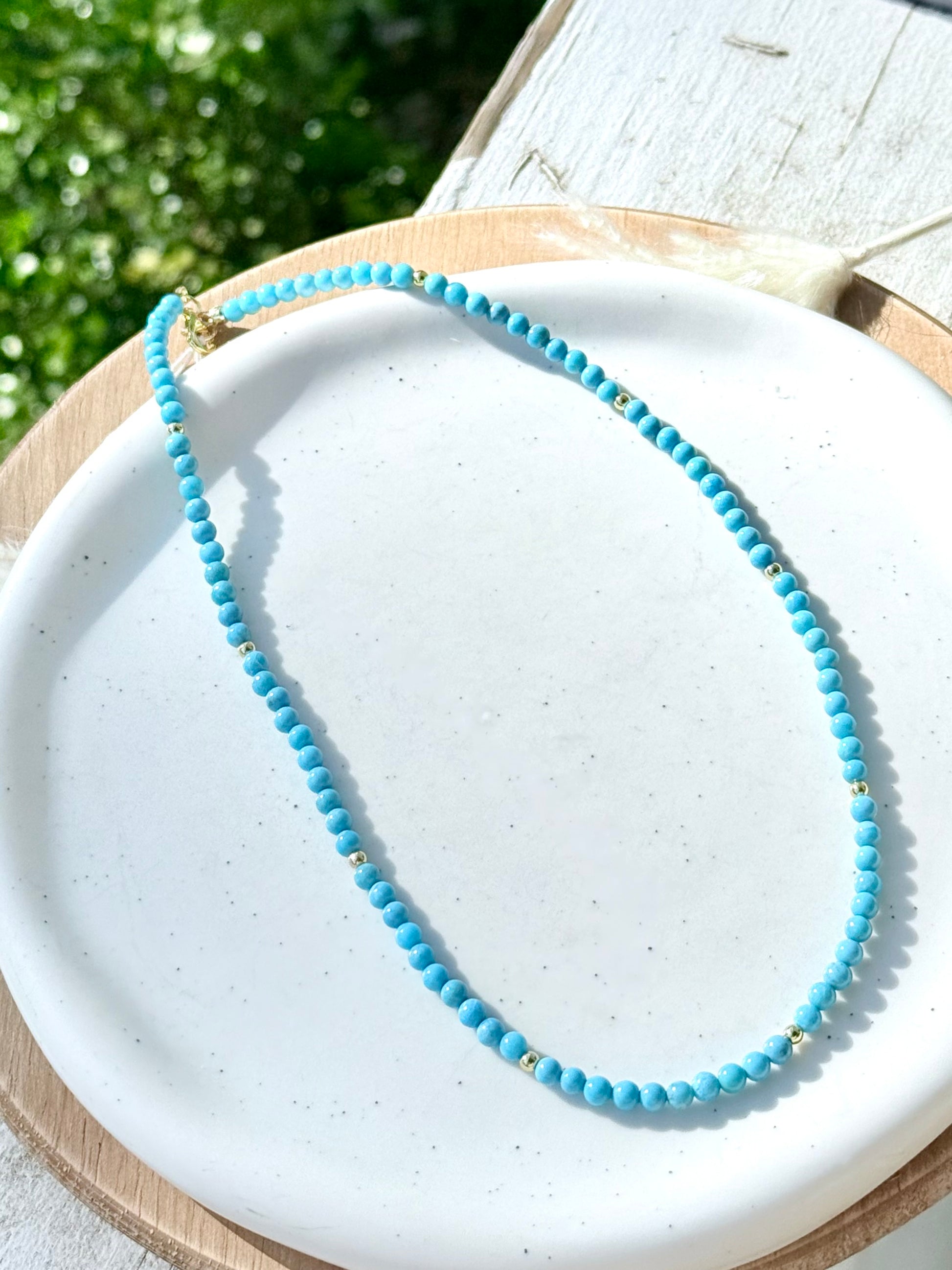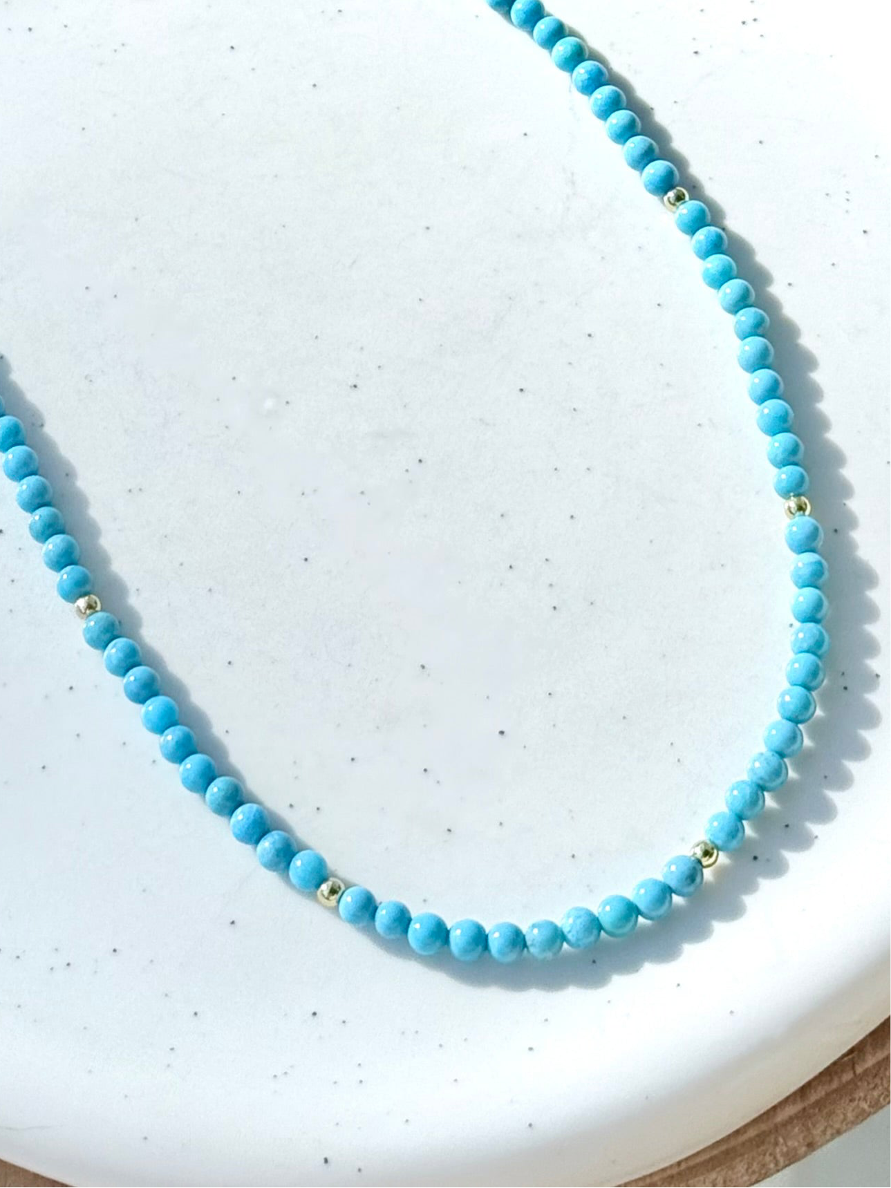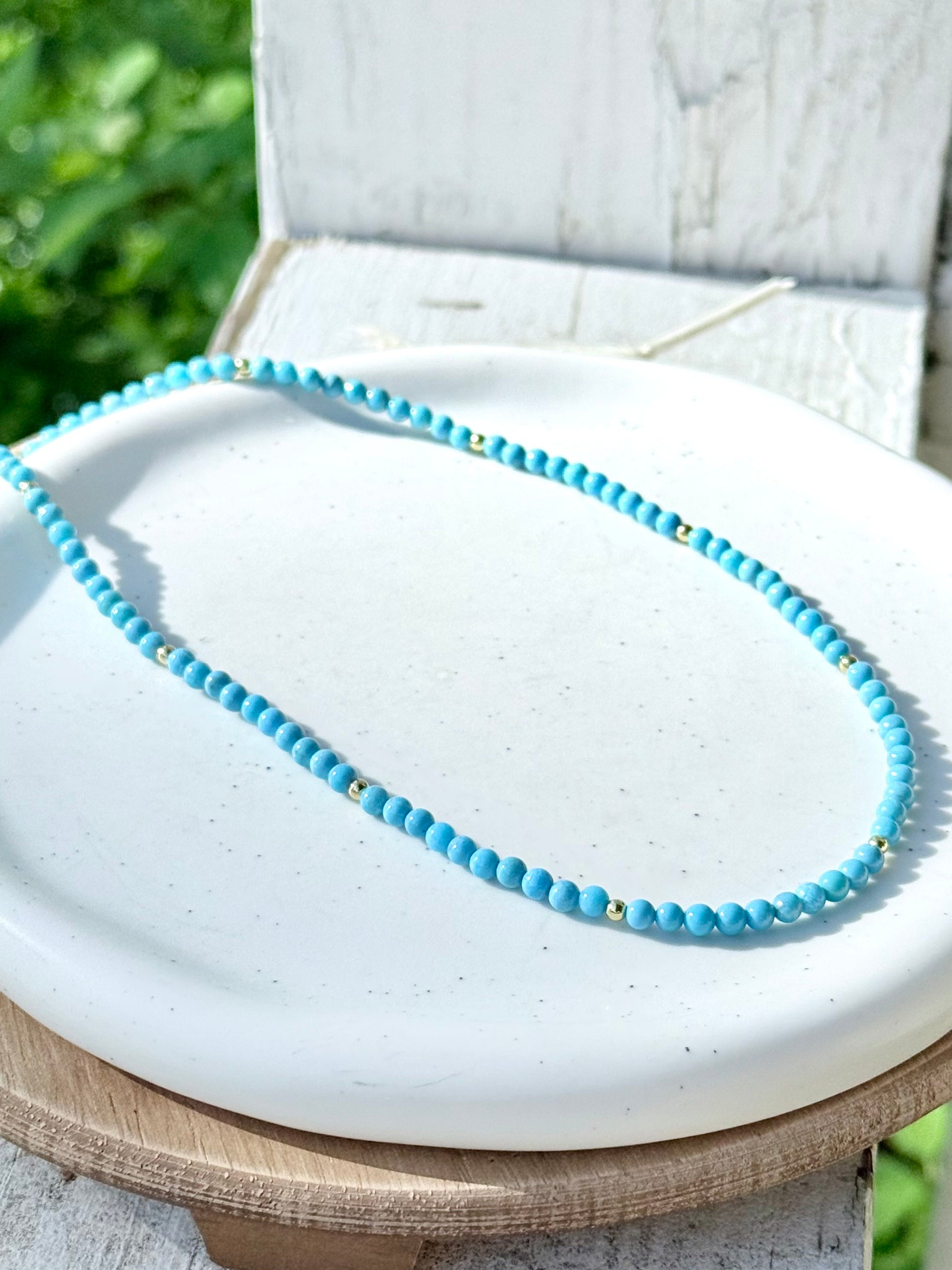 - Authentic, 4mm round, Sleeping Beauty Turquoise gemstones with gold filled spacers