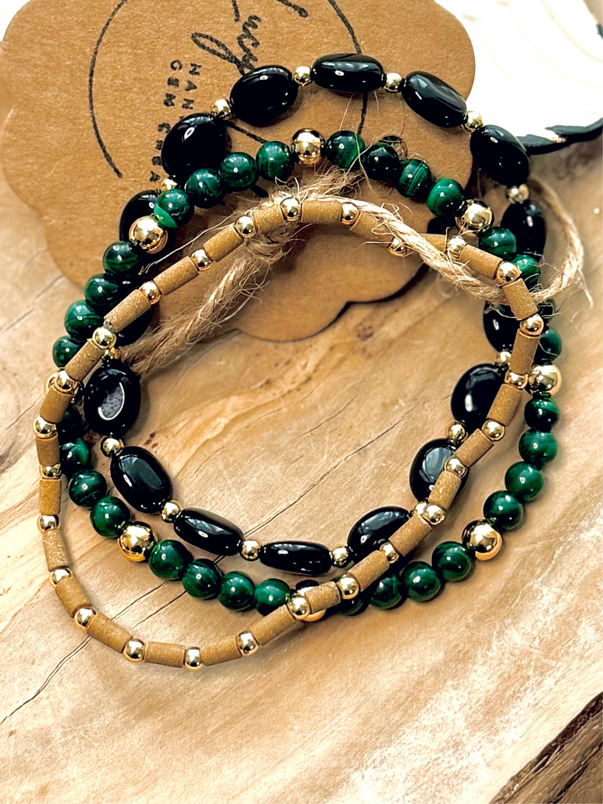 - Beads include: rainbow obsidian, malachite + Afghan heishi