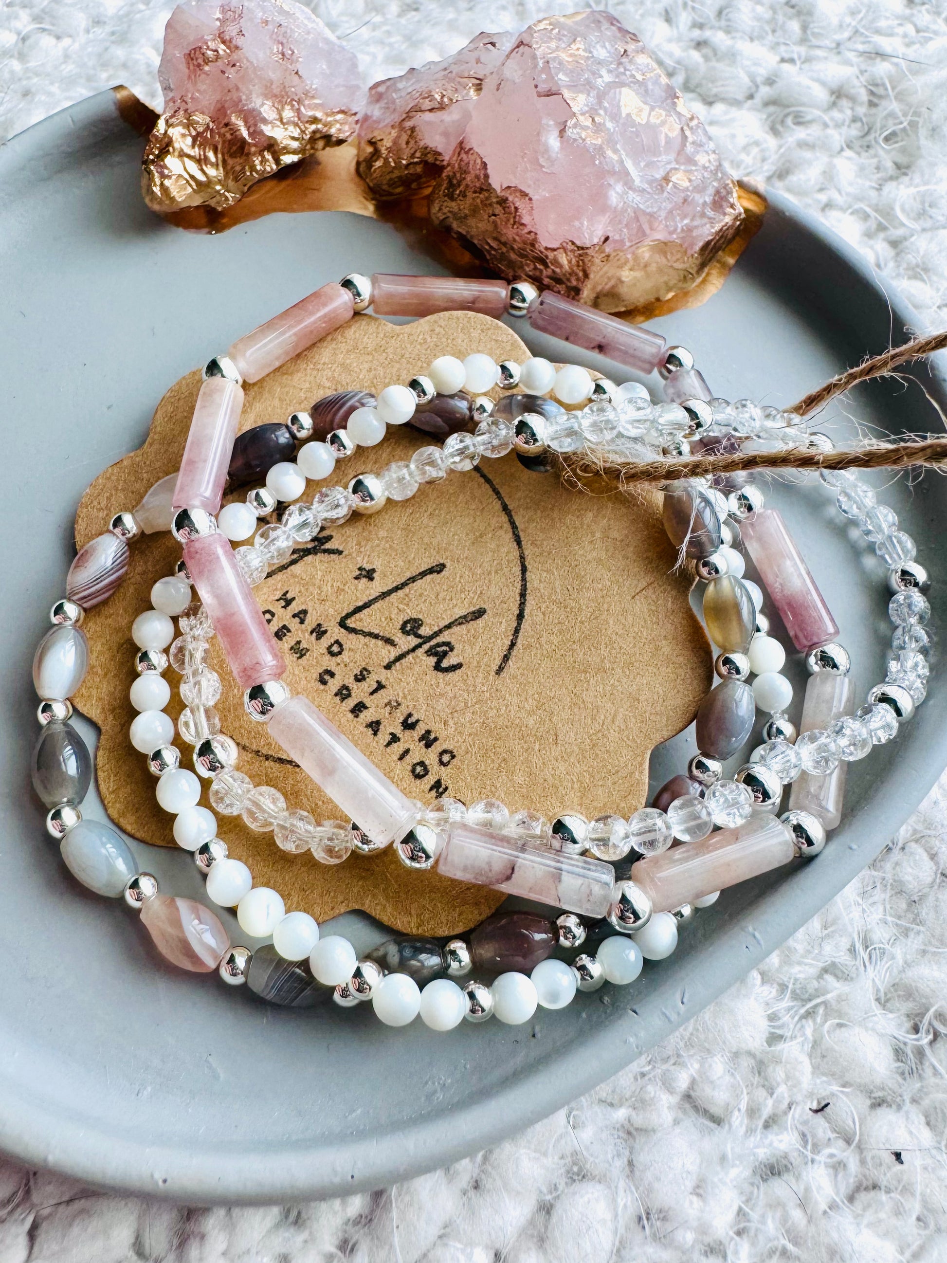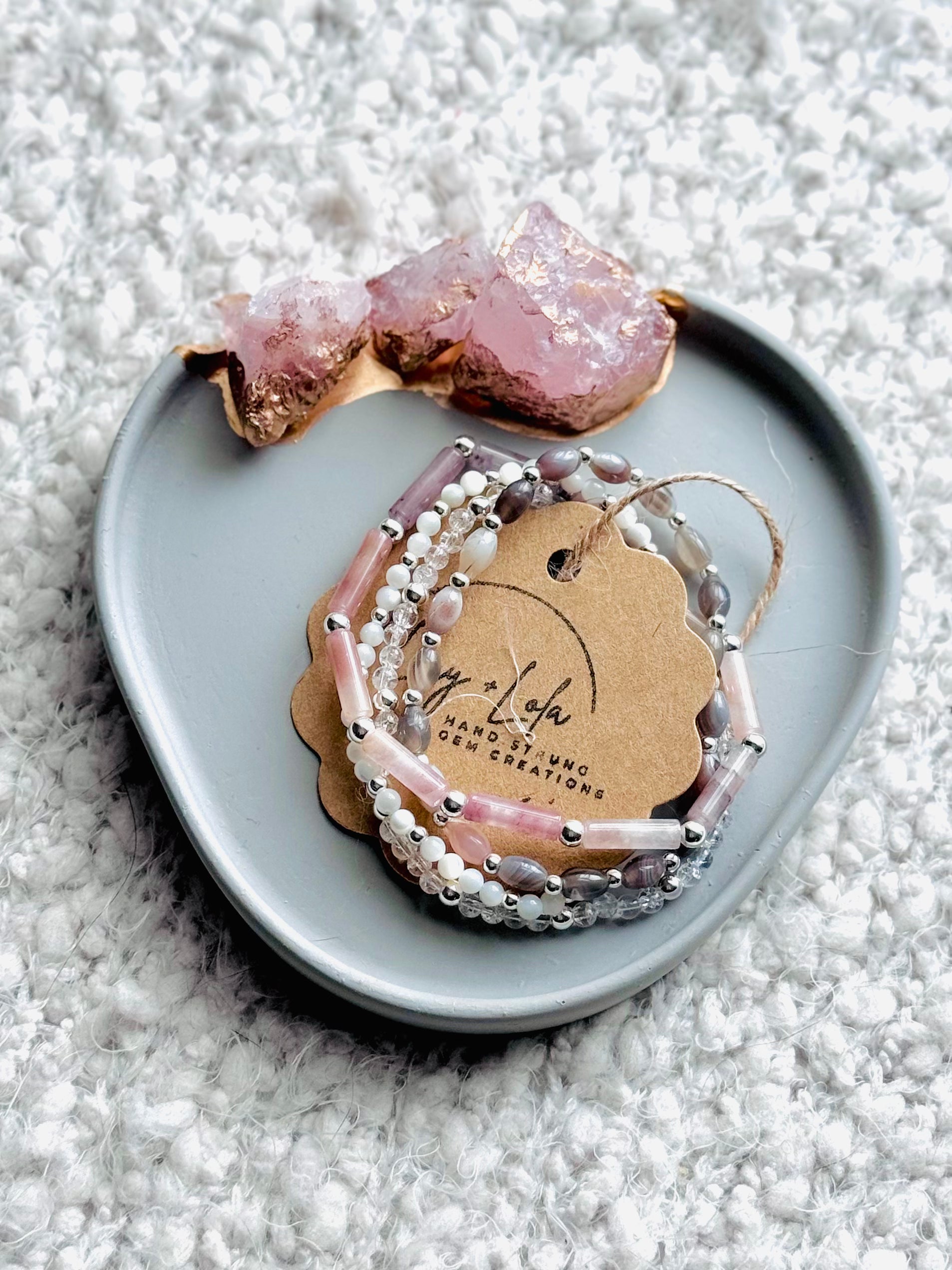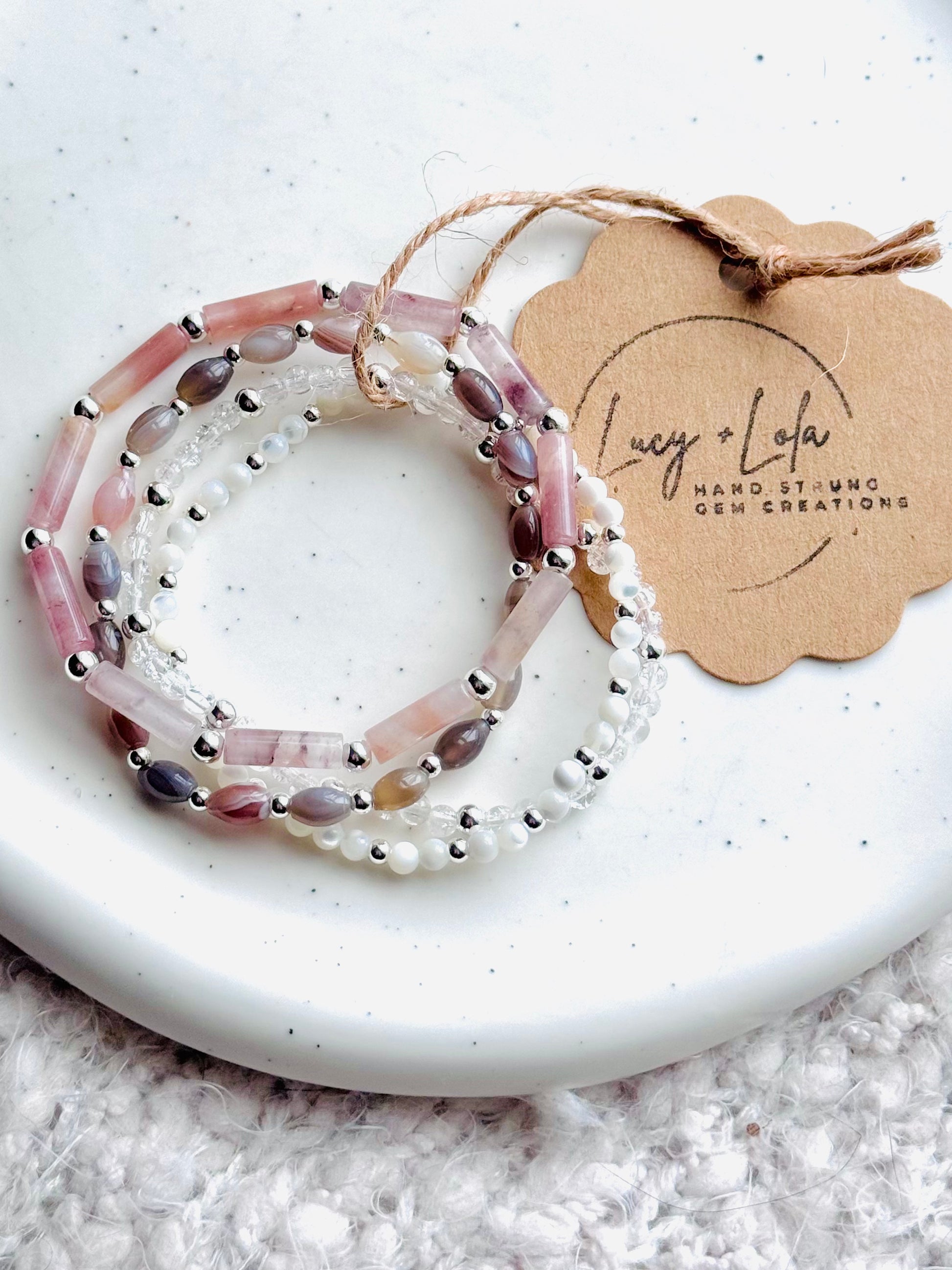 - Beads include: Mauve phantom quartz, Botswana agate, cracked quartz + mother of pearl
