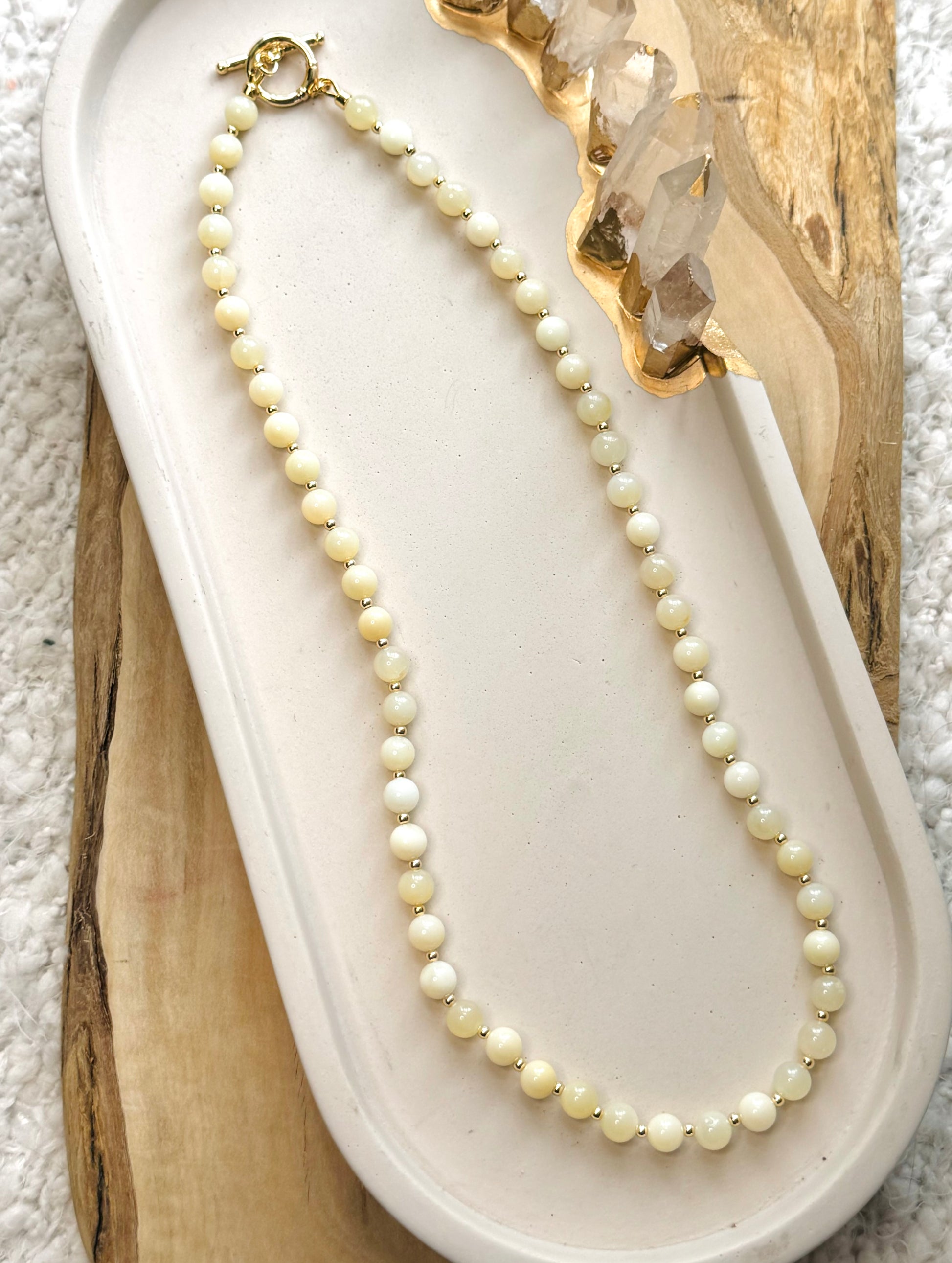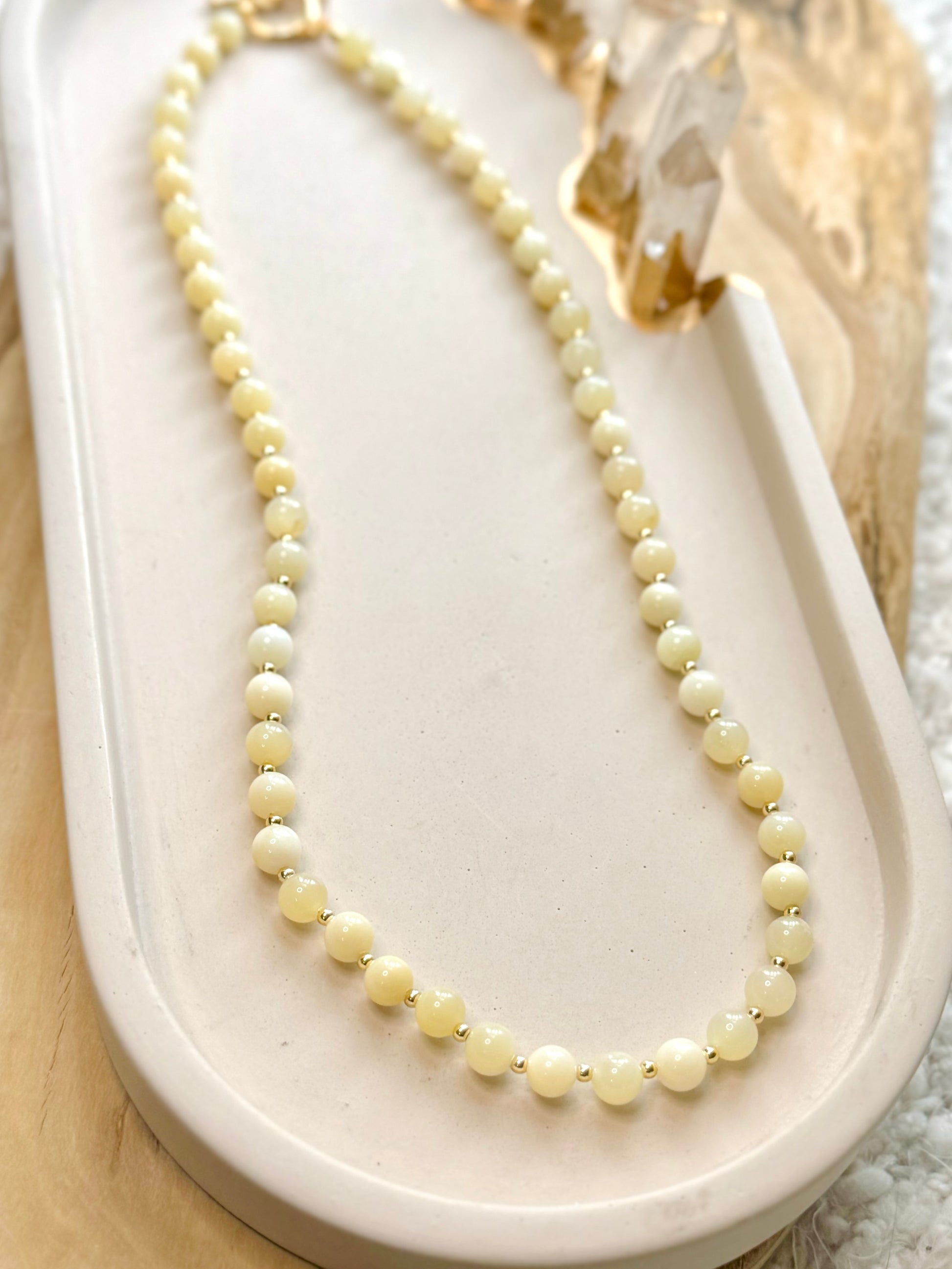 - 6.0mm milky, green opal beads, with gold plated spacer beads