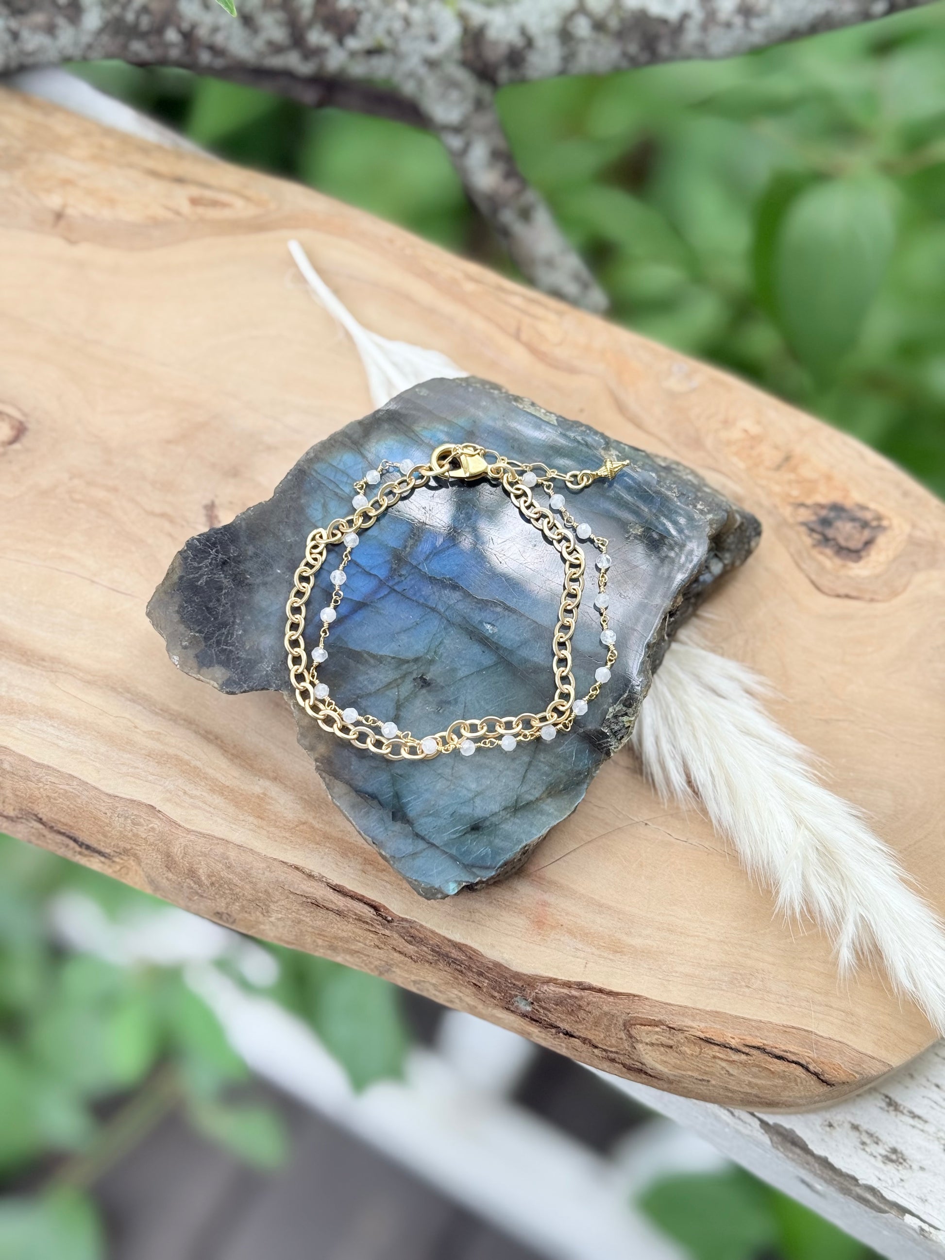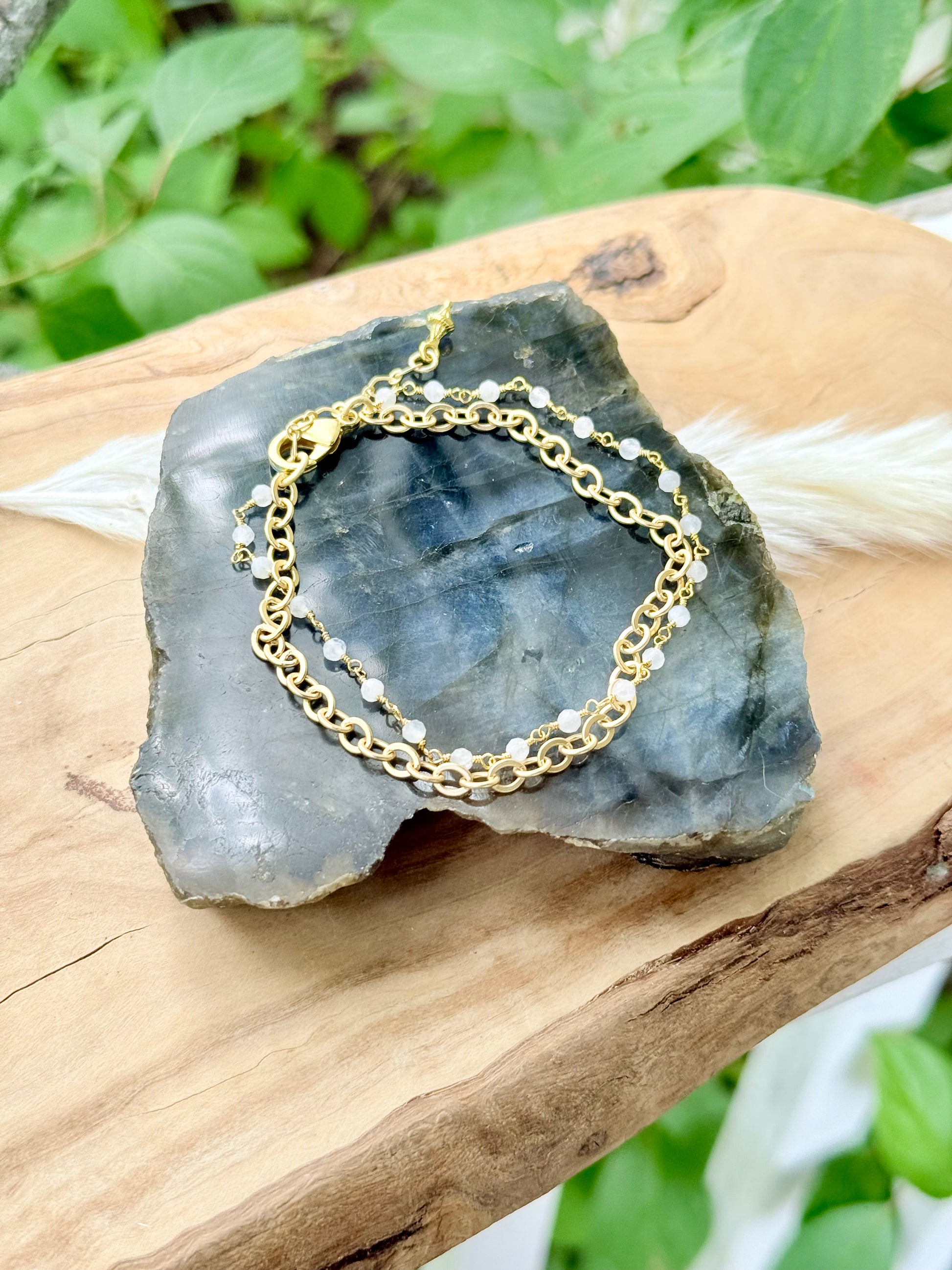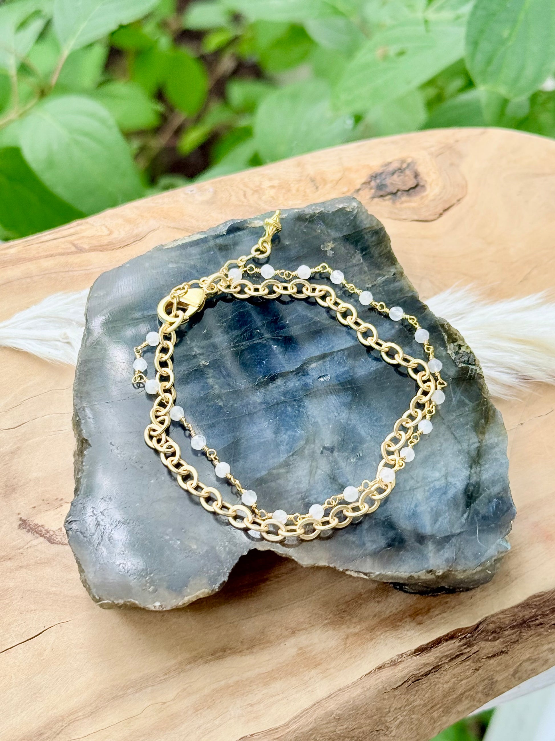 - Includes a matte gold chain and a hand-wrapped rainbow moonstone chain