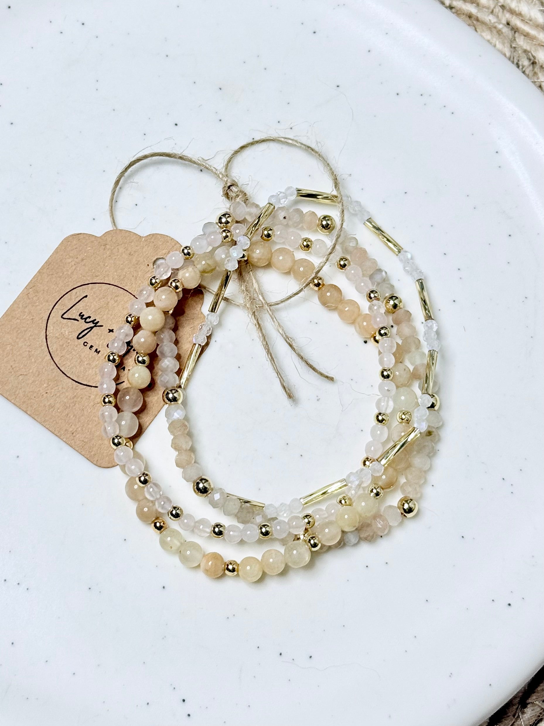 - Beads include: moonstone, Czech glass, rose quartz