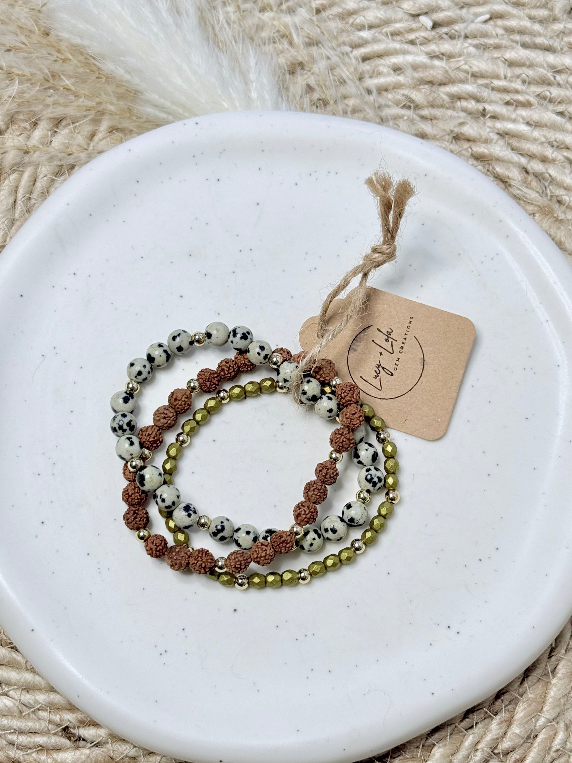 - Beads include: Czech glass, Dalmatian jasper + Rudraksha bodhi seed