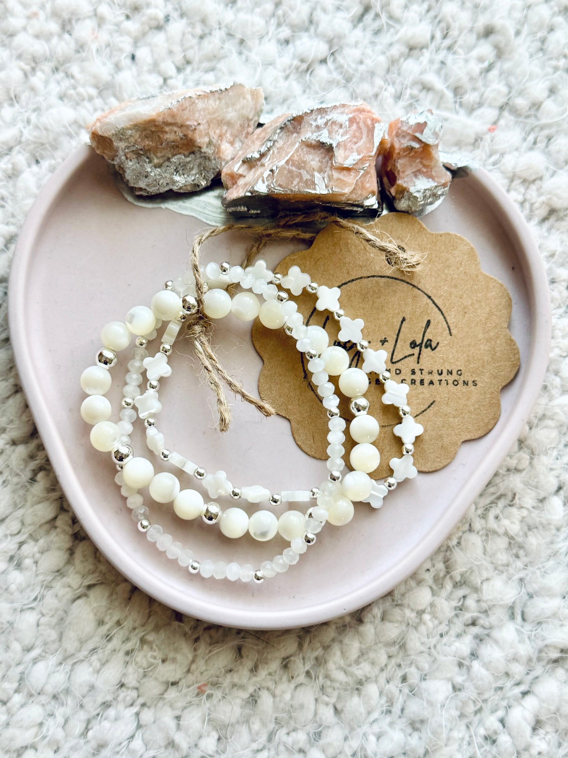 - Beads include: mother of pearl + moonstone