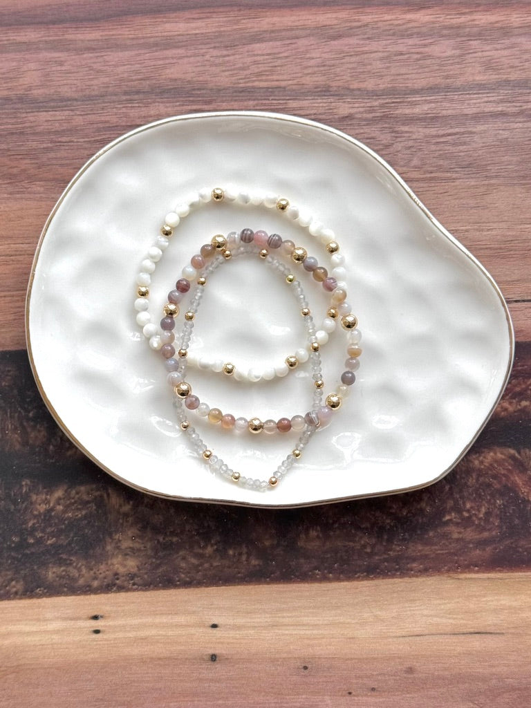 - Beads include: Botswana agate, mother of pearl, labradorite