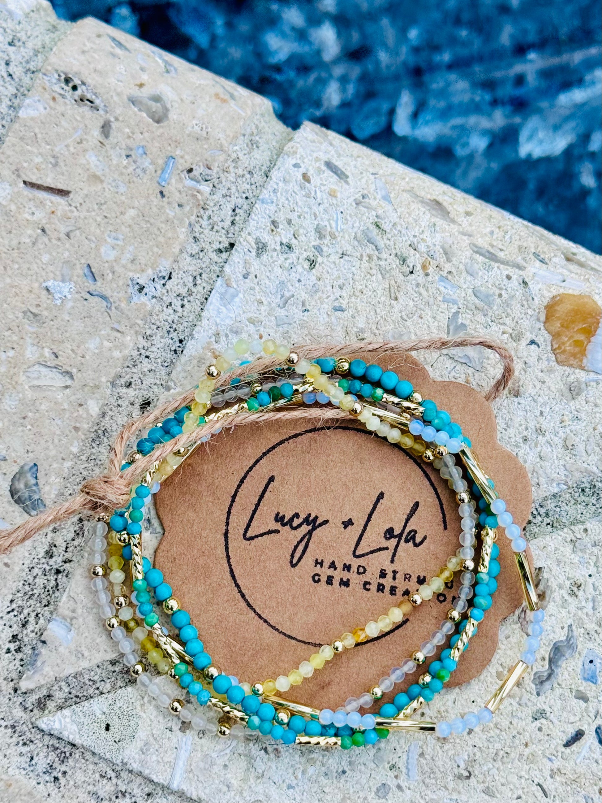 - Beads include: Turquoise howlite, jade, yellow opal, opalite + chrysocolla