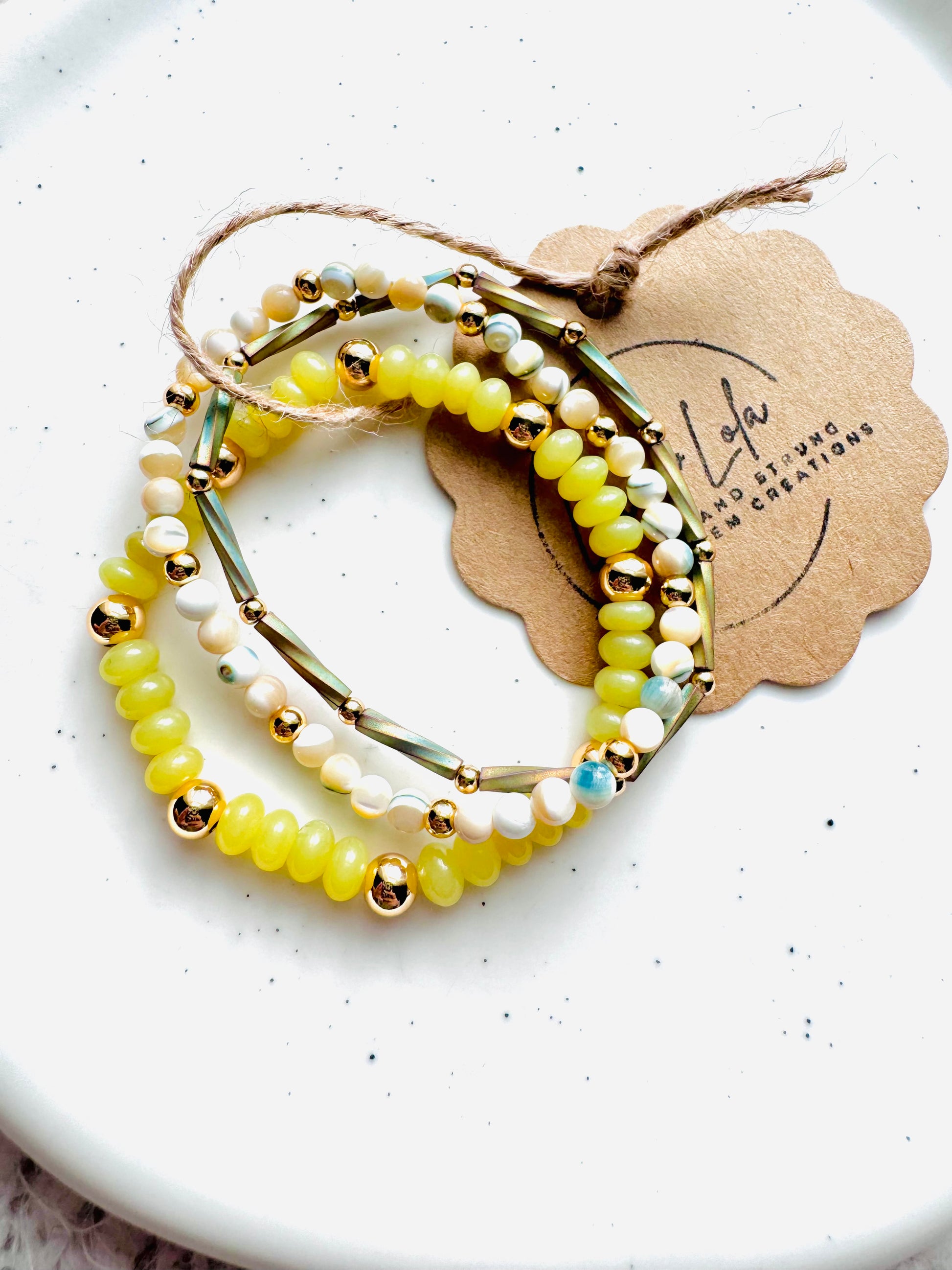 - Beads include: olive made, mother of pearl, Czech glass beads