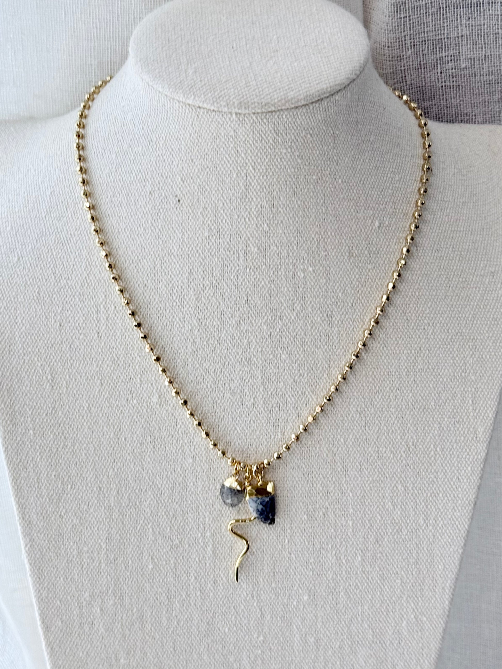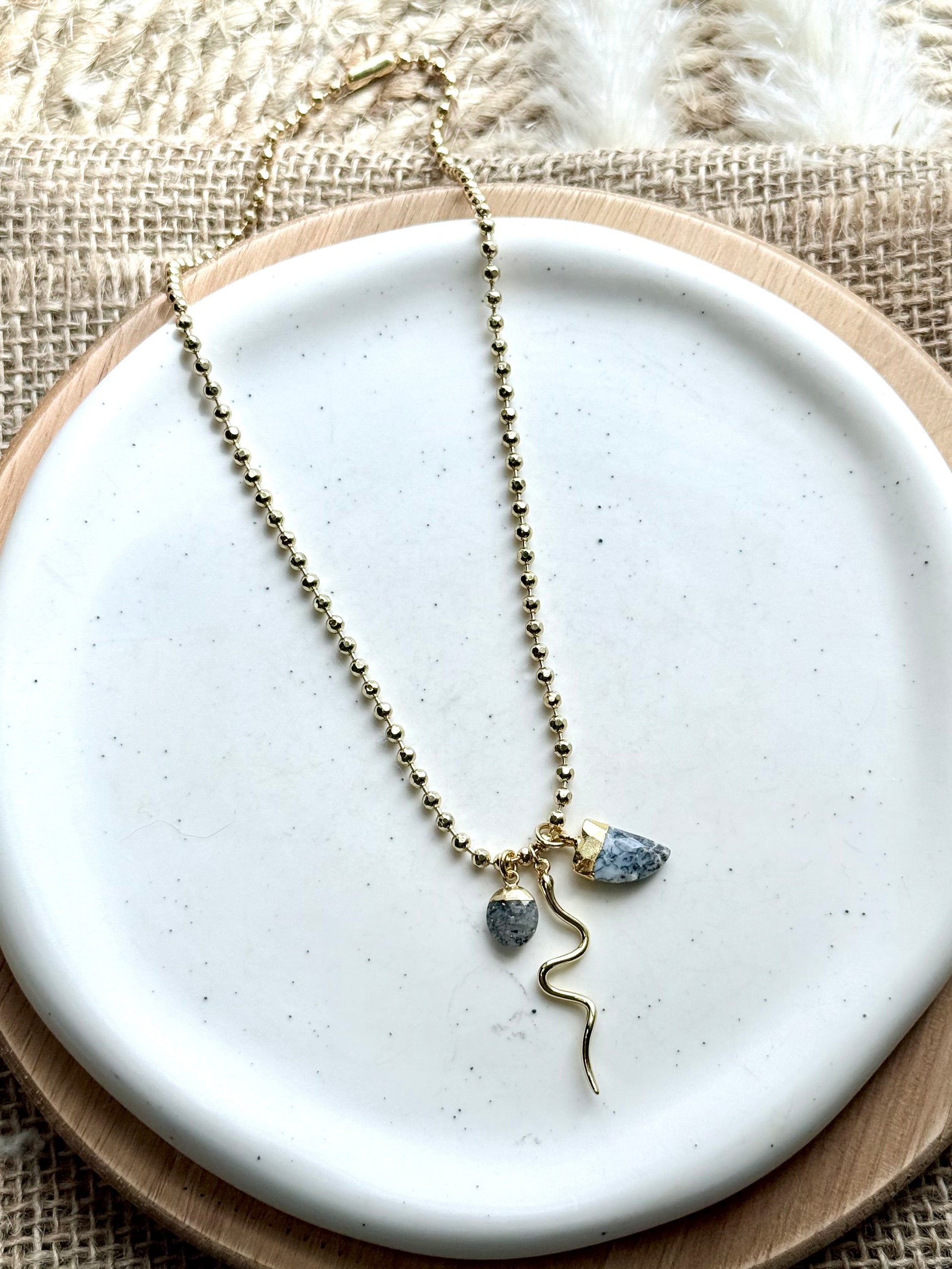 - Includes a trio of pendants: dendritic opal, black sunstone + snake charm