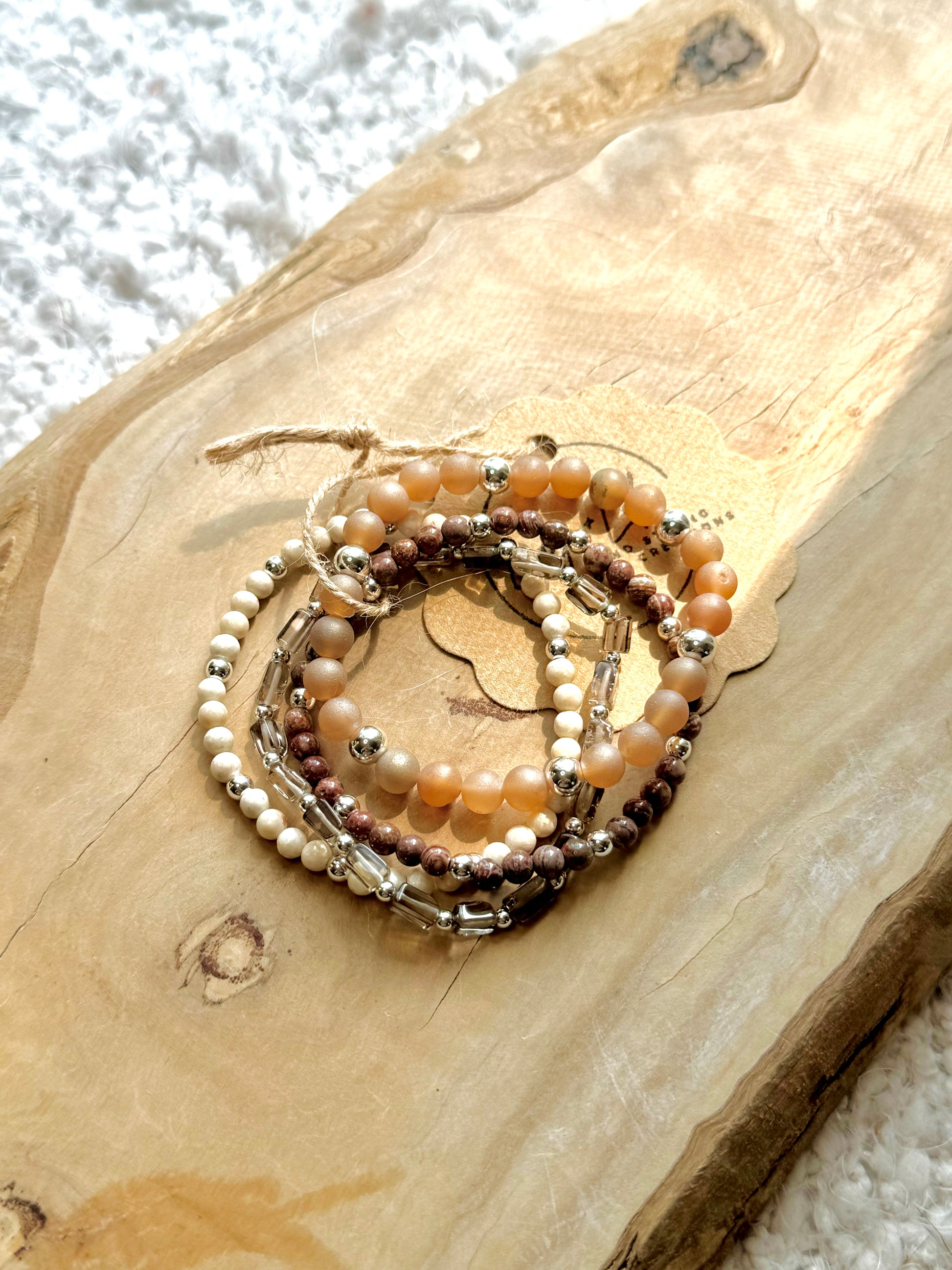 - Beads include: druzy agate, jasper, smokey quartz + riverstone