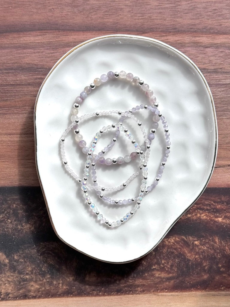 - Beads include: lepidolite, rose quartz, lavender cat eye, mystic quartz
