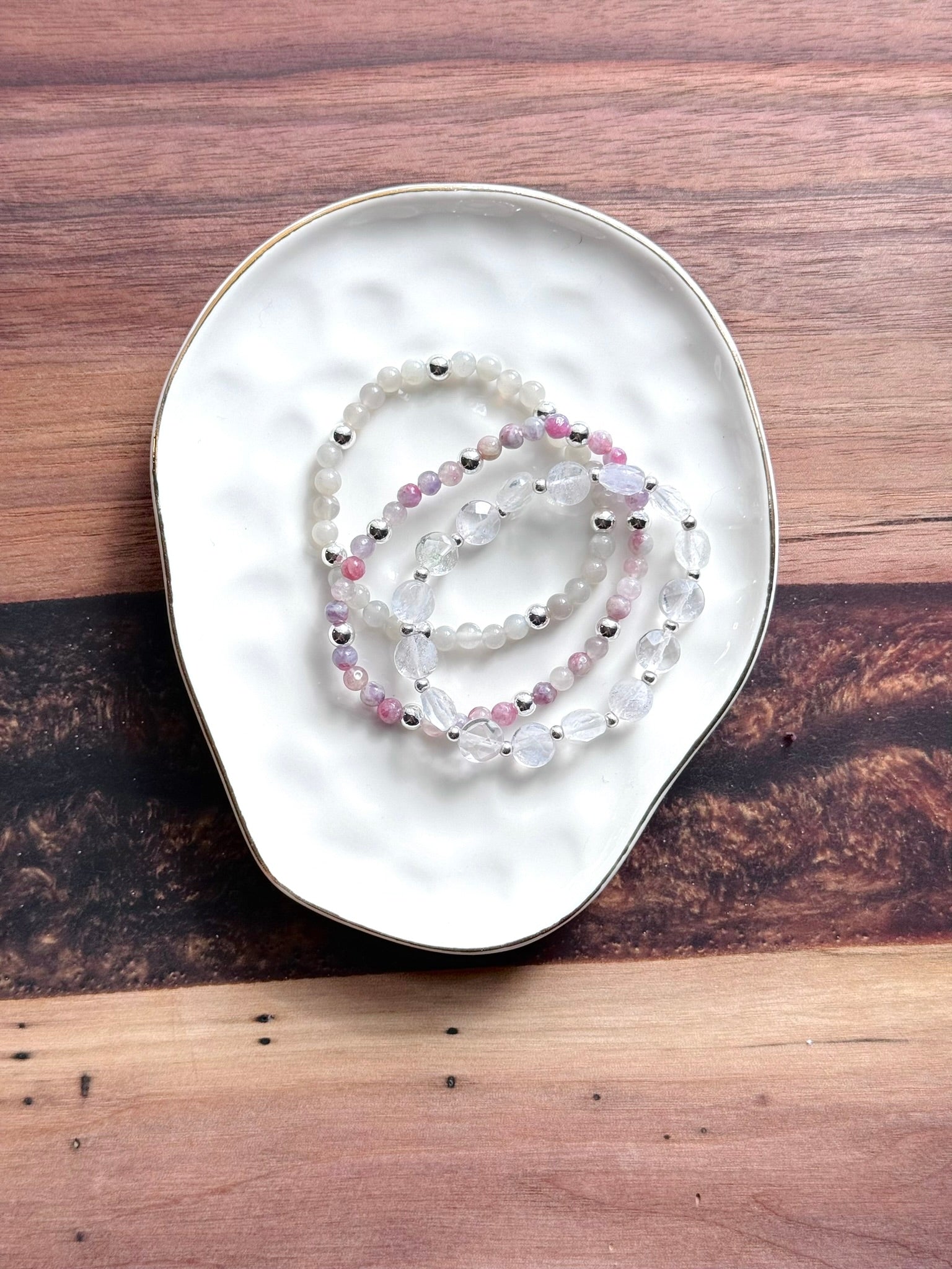 - Beads include: lepidolite, lavender amethyst, grey moonstone