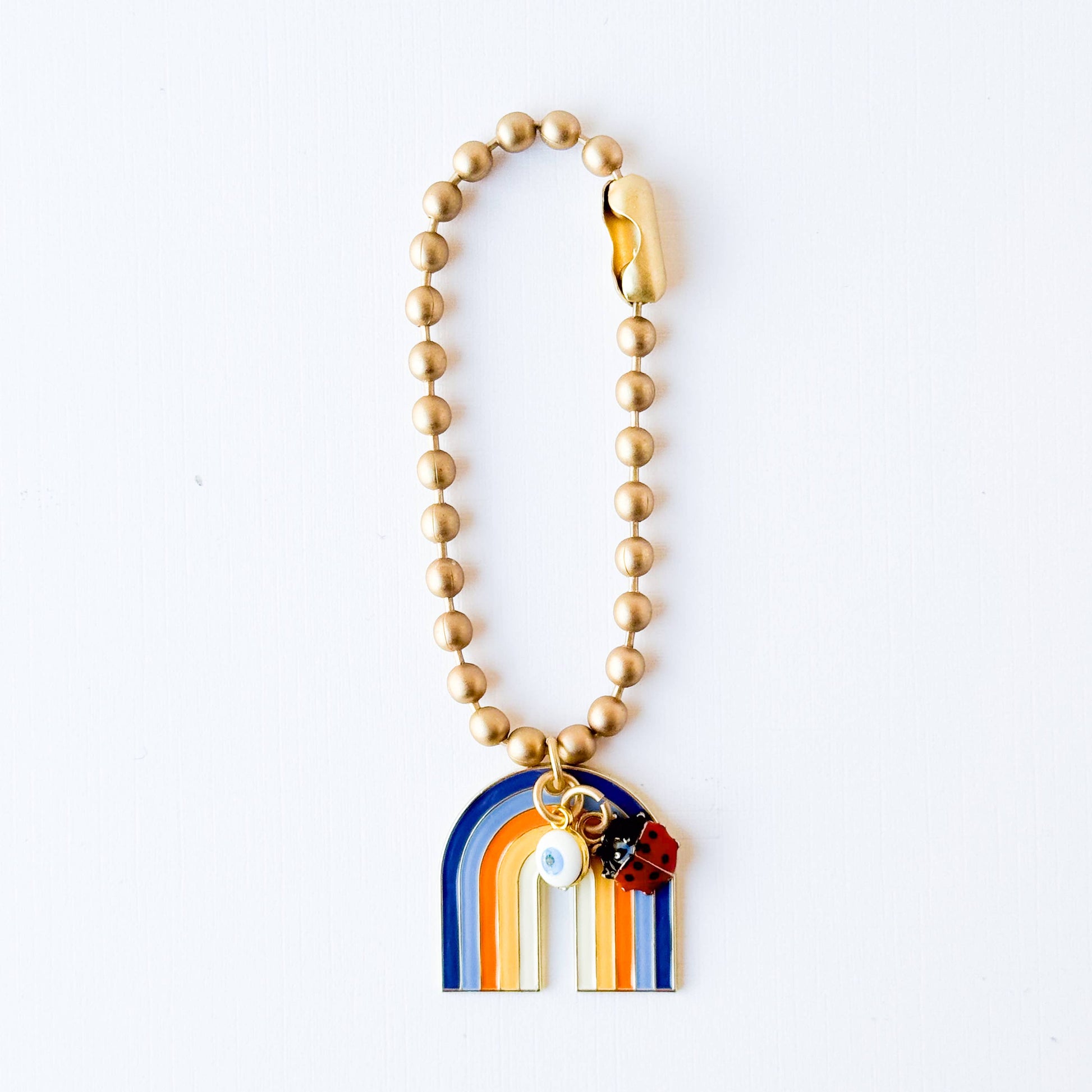 Featuring a 24K matte gold plated big ball chain and a large enameled rainbow charm with a tiny evil eye and ladybug for extra luck and protection.