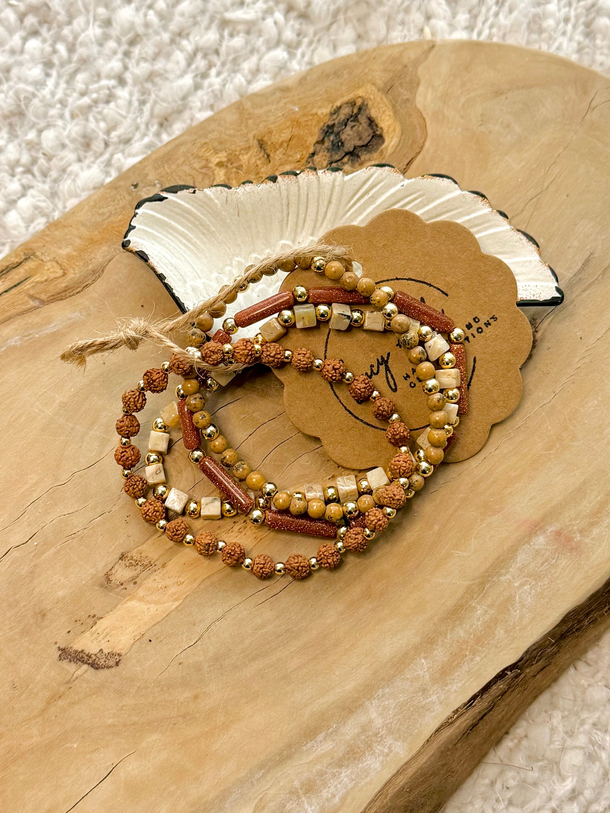 - Beads include: goldstone, bodhi lotus seed, jasper + African opal