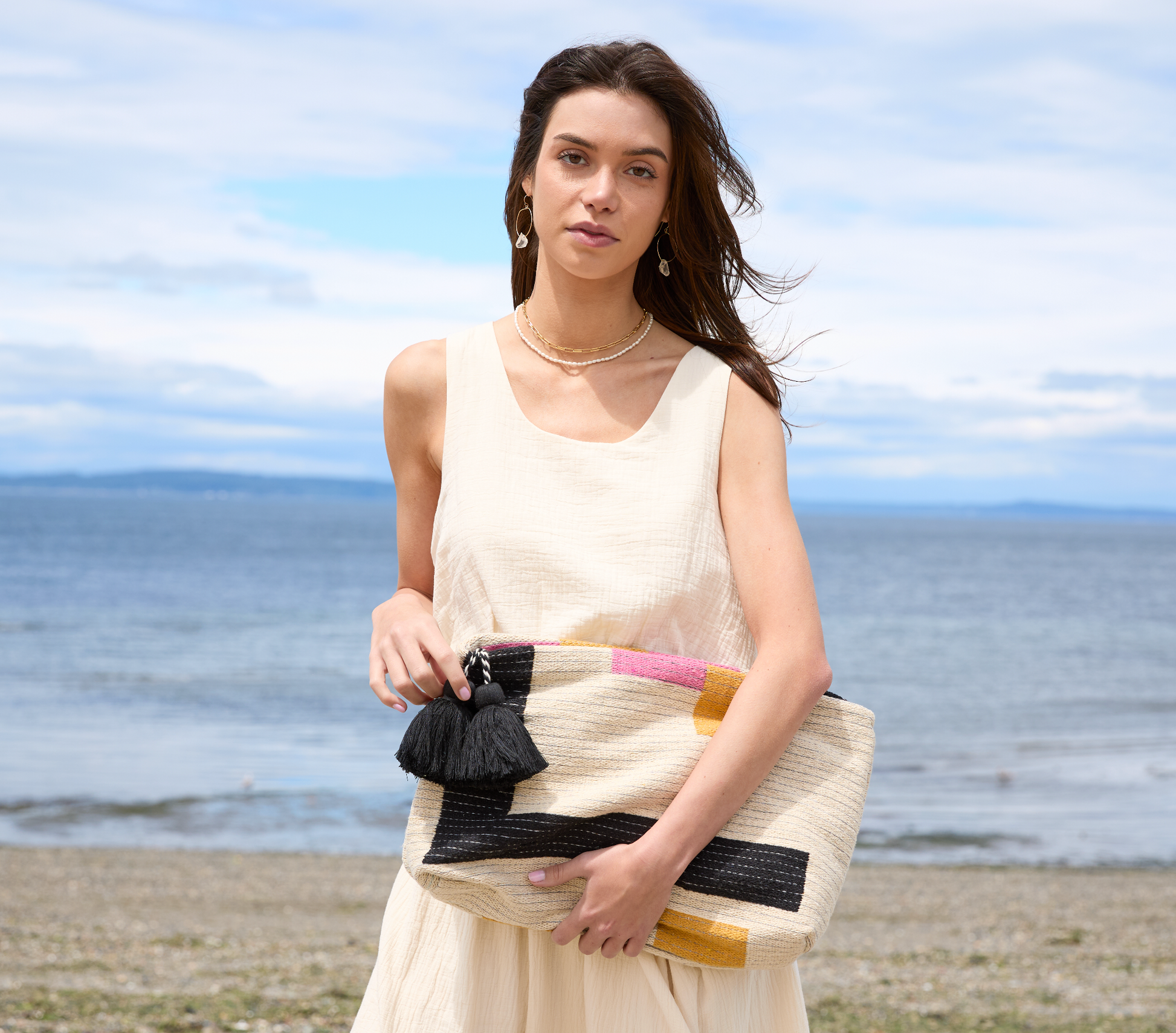 Oversize clutch with a colorful print and large cotton tassels, this clutch is a chic accessory to add to your closet. Extra large with zipper closure and interior zipper pocket (this clutch is perfect for a night out or to use as an extra large toiletries bag.
