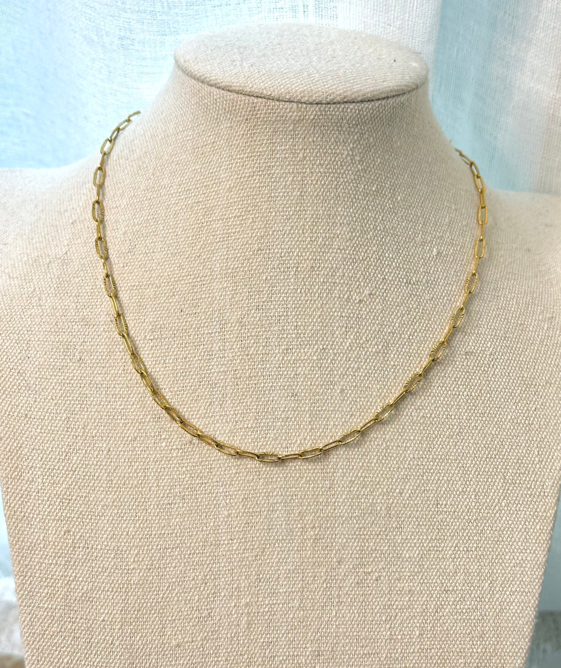 - 16-inch, textured paperclip , waterproof gold chain