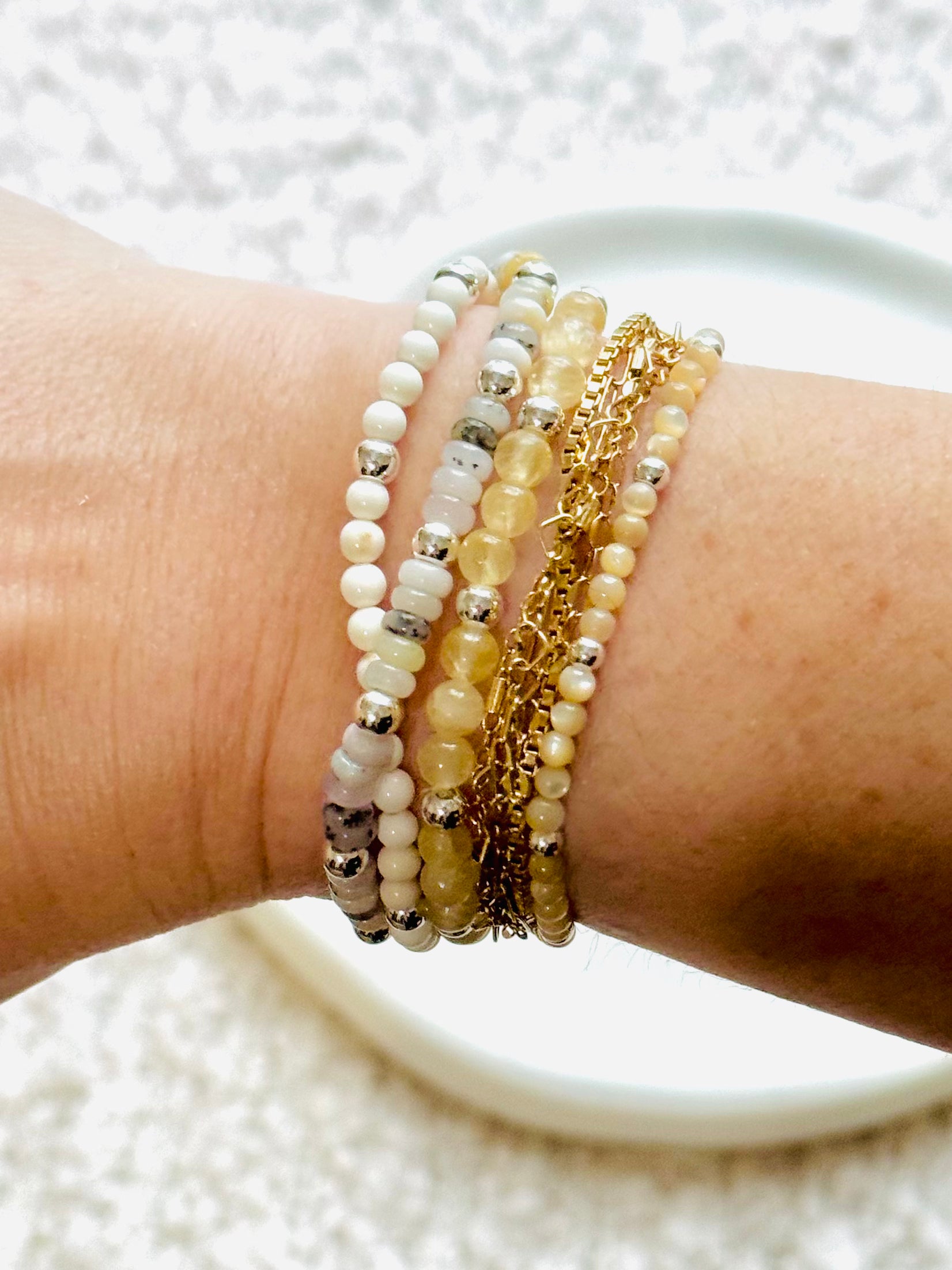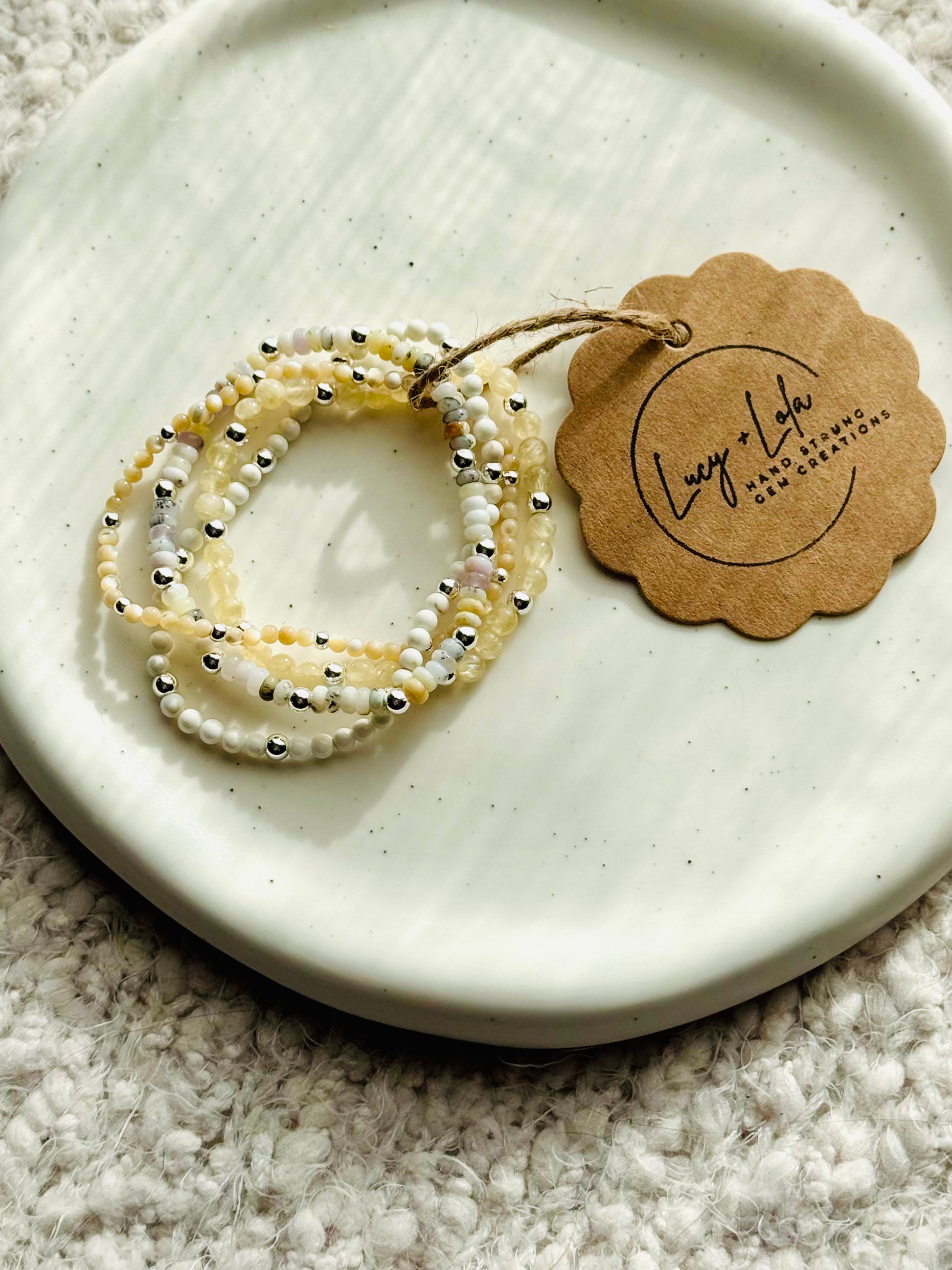 - Beads include: mother of pearl, yellow calcite, white opal and howlite